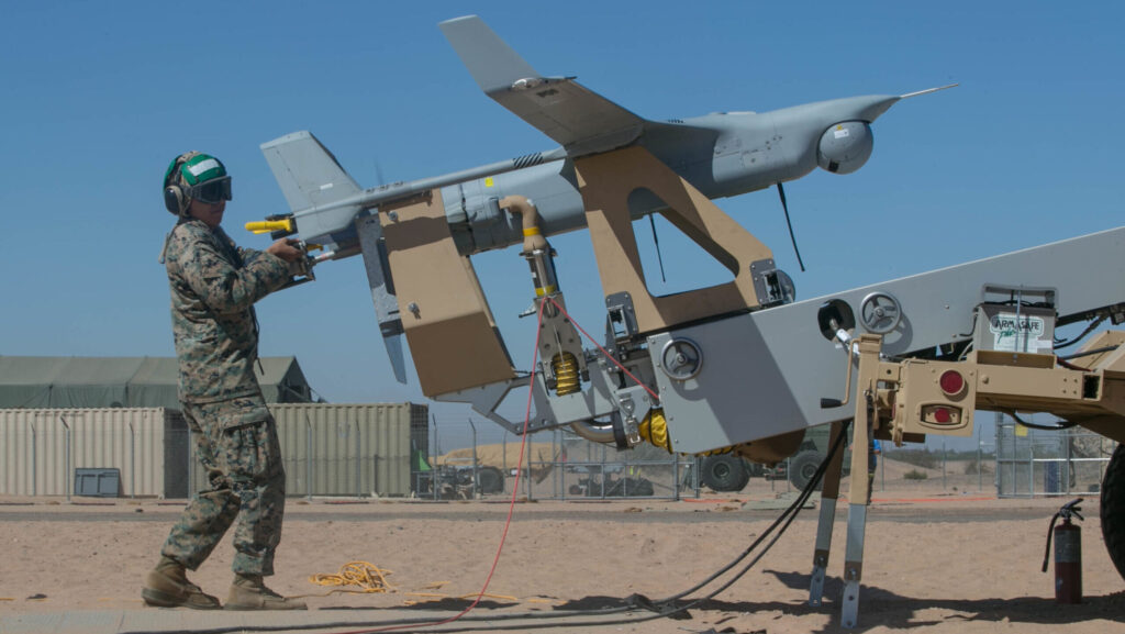 US Marines with Marine Unmanned Aerial Vehicle Squadron One prepare to launch a RQ-21 Blackjack UAS, a Group 3 drone, at Yuma, Ariz., on Oct. 13, 2017. (U.S. Marine Corps photo by Lance Cpl. Rhita Daniel)