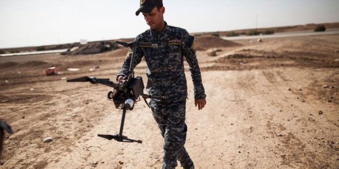 An Iraqi Policeman carries a drone near the village of Arbid, on the southern Mosul front, on … [+]