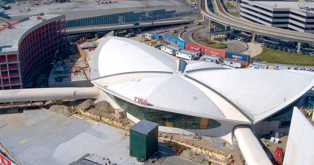 MCR and MORSE Development have been working to construct the resort to align with the aesthetic of the Flight Center, which was designed by Eero Saarinen and first opened again in 1962. The drone flight at JFK captured aerial footage to doc the development of the brand new, retro-looking resort.