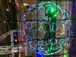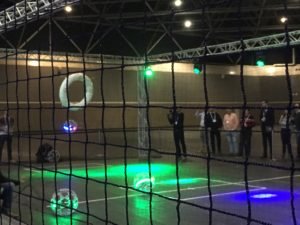 Here’s how it works. Two teams of drone operators face off at either end of a drone cage, representing the soccer field. The goals are two rings suspended by ropes – which means that they swing out of the way if struck on the sides. The soccer balls are drones suspended in a round cage, which protects the drone when it lands (or falls) to the ground. Different colored lights identify each team’s ball. Operators must fly their drones through the goal at the opposite end of the cage – cooperating when they can, and adjusting their technique against the other team to get the most goals in a set time.