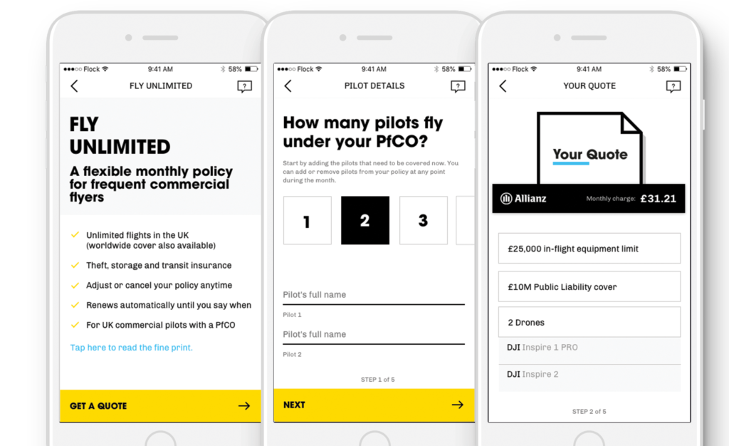 Flock’s Fly Unlimited policies are underwritten by its global insurance partner, Allianz. Cover starts from £24.95 a month, and pricing is driven by the risk-insights Flock has gathered through insuring thousands of drone flights via its Pay-as-you-fly option.