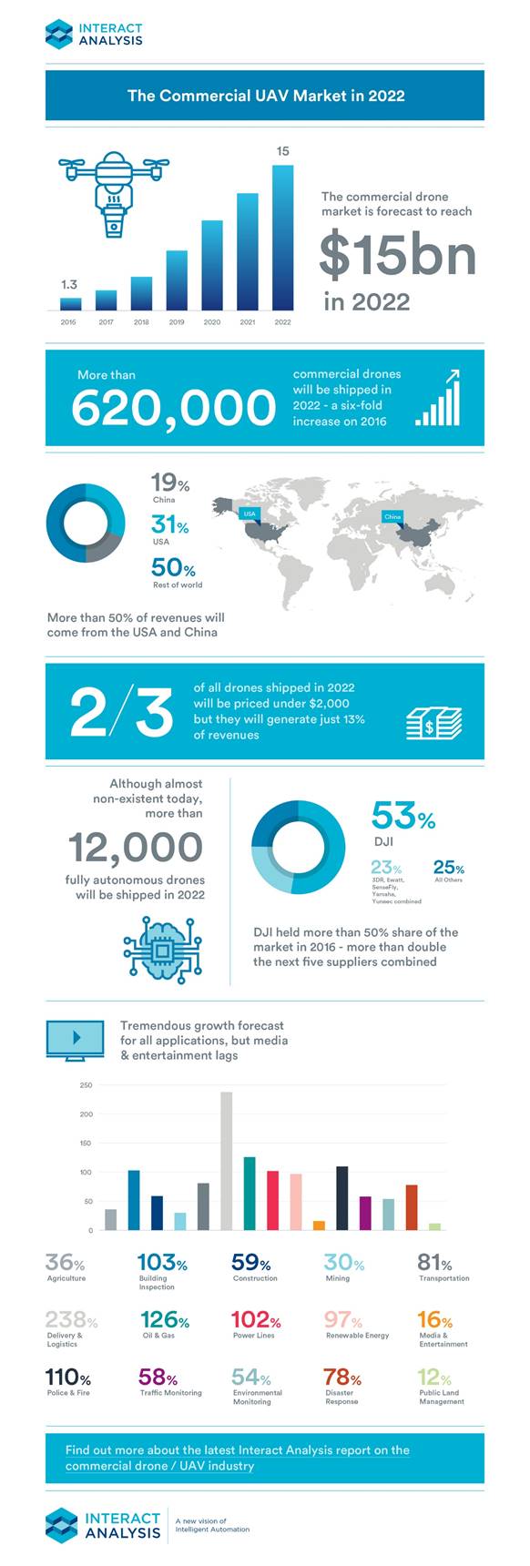 “DJI’s dominance of the consumer drone market is also very evident in the commercial sector. The company held a 53% share of the market last year – more than double the share of the next five largest suppliers combined,” says Interact. “When you exclude “prosumer” purposes, DJI’s share drops significantly, nevertheless.”