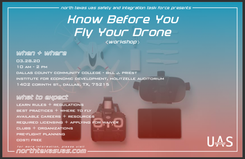 The North Texas UAS Safety and Integration Task Force is stepping up with sponsors including WomenandDrones, AUVSI Lonestar, and drone industry solution providers to provide a free “Know Before You Fly” training workshop for new drone flyers.
