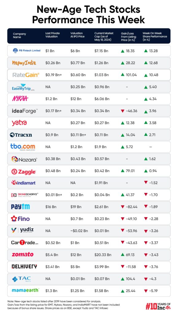 Ten new-age tech stocks under Inc42’s coverage gained this week in a range of 0.9% to over 13%. PB Fintech shares rallied 13.3% this week