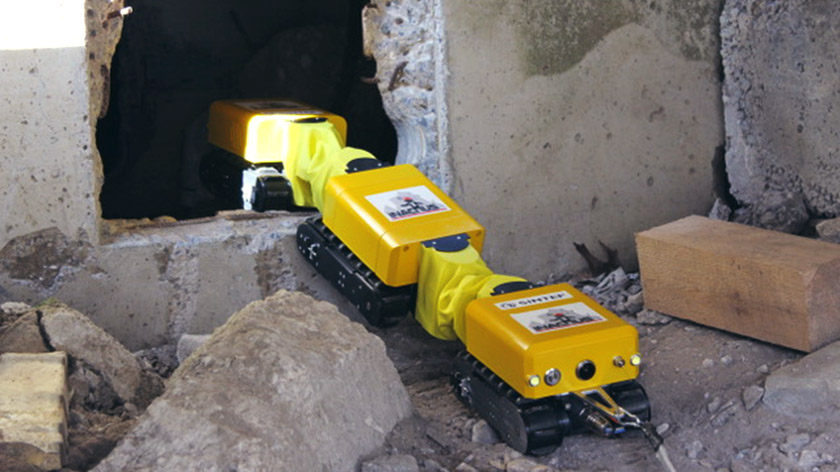 At ground level, a miniaturised robotic prototype incorporating a number of novel technologies and sensors was trialled in four large-scale pilots. The remotely controlled robot was specifically designed to help rescue teams to find and communicate with victims trapped under collapsed buildings.
