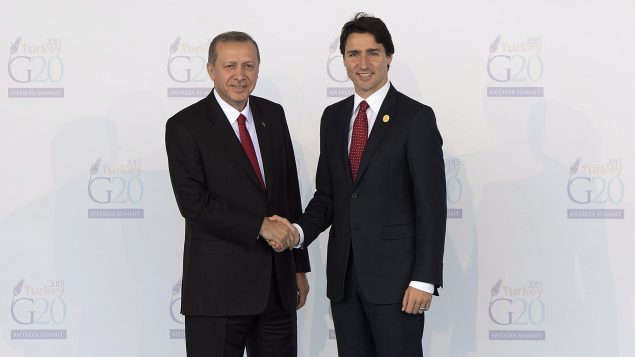 FILE PHOTO: Prime Minister Justin Trudeau is greeted by Recep Tayyip Erdogan, President of Turkey, as he officially arrives to the G20 Summit in Antalya, Turkey on Sunday, Nov. 15, 2015. (Sean Kilpatrick/THE CANADIAN PRESS)
