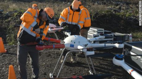 The eight-foot drones, up to five at a time flying together on pre-programmed routes, can cover up to 50 acres a day and each carry as much as 57 pounds of seed vessels, DroneSeed CEO Grant Canary told CNN Business.