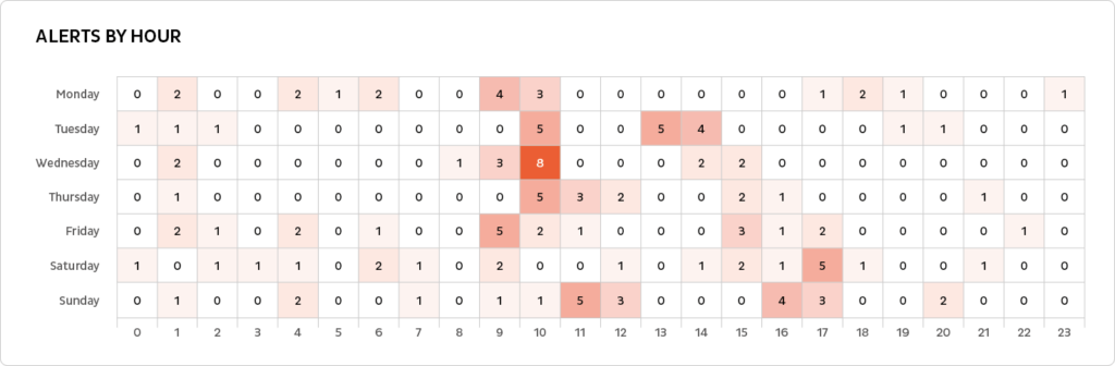 The alerts by sensor chart how drone alerts may affect certain areas of the facility, especially when there are certain sensors with larger percentages of detections than others. This chart is particularly helpful for installations with a larger footprint, or area to protect, which may be deploying several sensors over a distributed over an area.