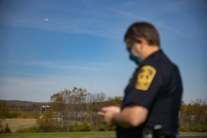 We were also able to demonstrate standards-compliant ways to enable remote identification. For example, one of the simulations was a drone delivery conducted while a temporary flight restriction (TFR) was in place for a nearby football game. A local police officer was tasked with monitoring the airspace for unauthorized drone operators using a remote ID display. The delivery drone had permission from the FAA to operate within the TFR. The USS verified the authenticity of the authorization prior to the flight, and then included the authorization in the remote ID data for the flight.