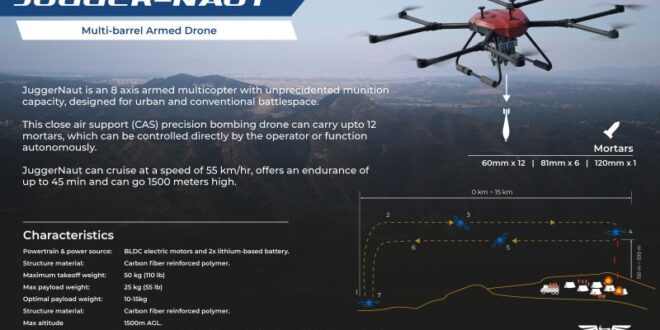 JuggerNaut is an octa-copter drone with a MTOW of 50kg and meticulously designed for battle-fields and air combats